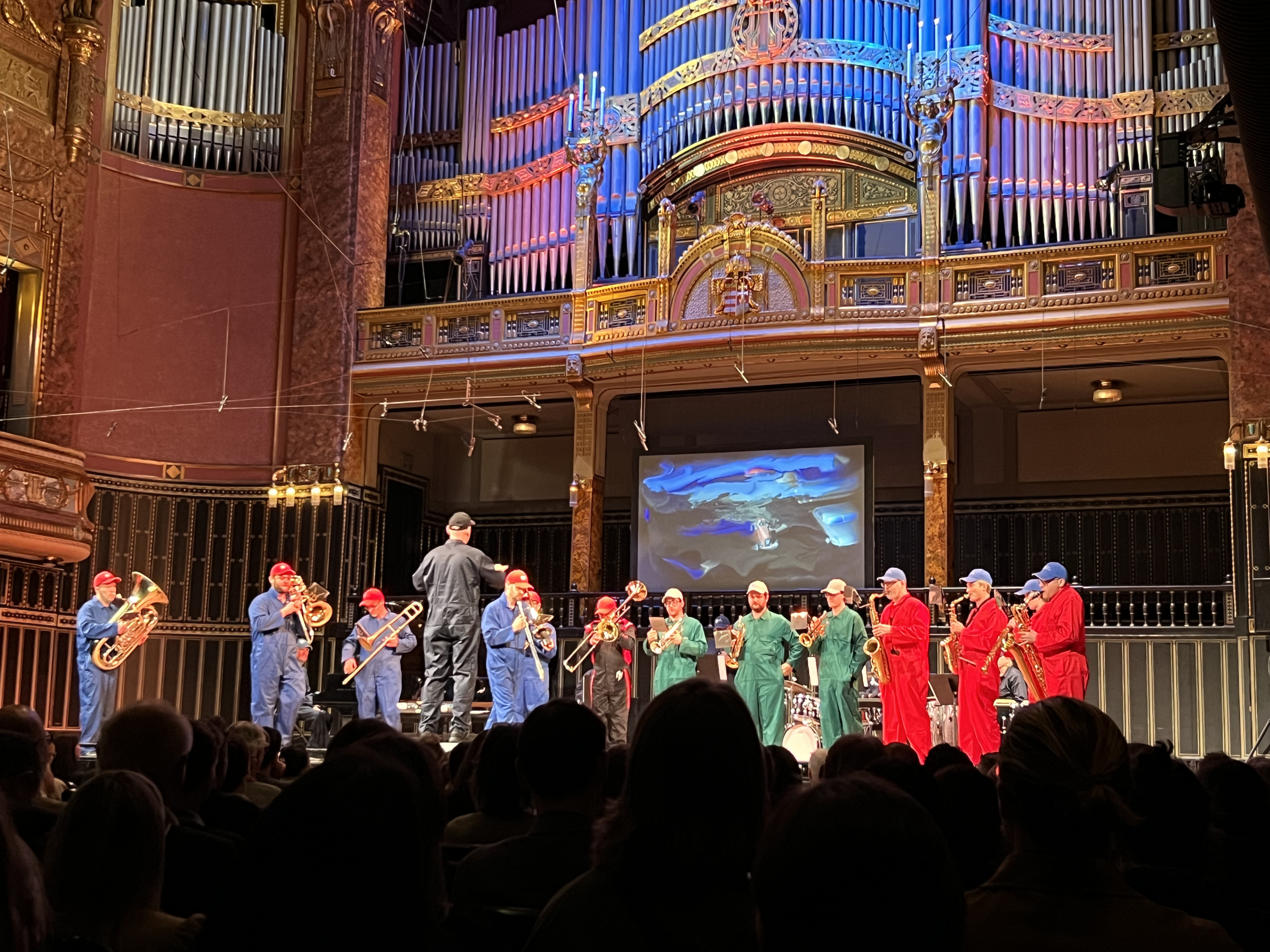 Am I tripping, or does the middle trombone have two horns (one facing backwards), and the ensemble is dressed like F1 pitstop attendants with a psylocibin-coloured projection in the back? Who can tell?